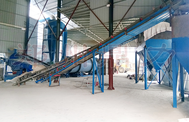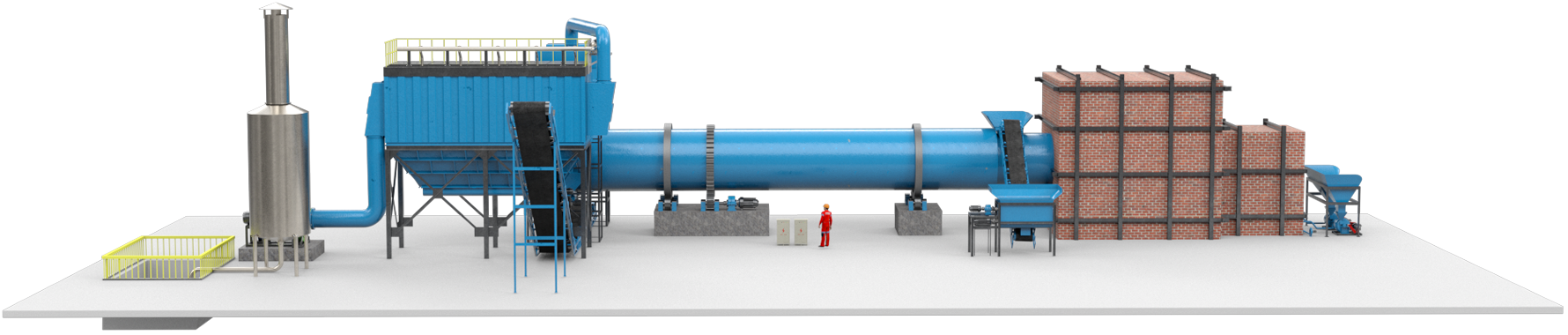 烘干系統(tǒng)主要由熱風(fēng)爐、上料輸送機、滾筒烘干機、出料輸送機、引風(fēng)機、旋風(fēng)除塵器、袋式除塵器(或者濕式除塵器)和操作控制系統(tǒng)構(gòu)成。設(shè)備采用順流干燥工藝,其工作原理如下:濕物料進入干燥滾筒后分以下幾個工作區(qū):一是導(dǎo)料區(qū),瓷泥瓷泥進入此區(qū)與高溫?zé)犸L(fēng)接觸迅速蒸發(fā)水分, 物料在大導(dǎo)角的導(dǎo)料板抄動下,被導(dǎo)入下一個工作區(qū);二是抄板區(qū),瓷泥瓷泥在此區(qū)被抄板抄起形成料幕狀態(tài),此時物料與熱風(fēng)充分接觸,瓷泥瓷泥中的水分迅速蒸發(fā)剝離成為水蒸氣,水蒸氣隨即被引風(fēng)機抽走,從而達到瓷泥瓷泥干燥的目的;瓷泥瓷泥在此區(qū)被干燥成水分小于5%(或者更低)以下的松散狀態(tài),經(jīng)過熱交換后物料達到所要求的水分狀態(tài),進入最后的出料區(qū);三是出料區(qū),滾筒在此區(qū)不設(shè)抄板,物料在此區(qū)滾動滑行至排料口,完成整個烘干過程。